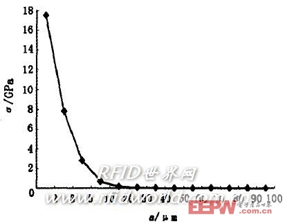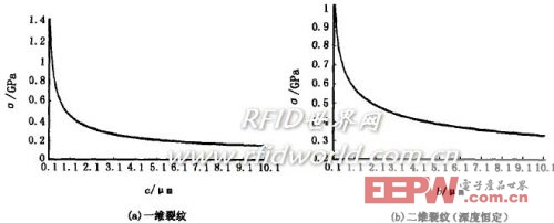 由 Giffith微裂纹扩展外面4可知,长度为a的一维裂纹的扩展判据为22Esa,若腐化后芯片背后残留裂纹长为c,并将杨氏模量E=106。 9GPa,轮廓能s=3。1J/m2等参数代入,可获得平面应力状况常载荷要求下芯片碎裂的临界强度为=0。46/c(GPa),图3(a)给出了 与芯片背后残留裂纹长度的对应相合。