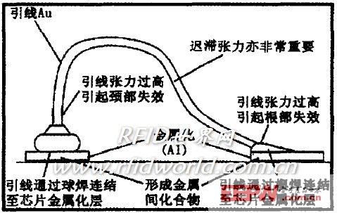 焊盘/引线界面需有合金化经过以造成优良的接触,但过渡的合金化会导致金属中央化合物 (IMC)的造成,惹起键合失效。键合引线的张力也是惹起键合失效的紧急参数之一,张力过小,会导致引线过于松软,与其他引线造成短道;引线张力过大则往往会惹起键合处的断裂或开裂,如图8(a,b)为键合失效样品的芯片的正面照片。