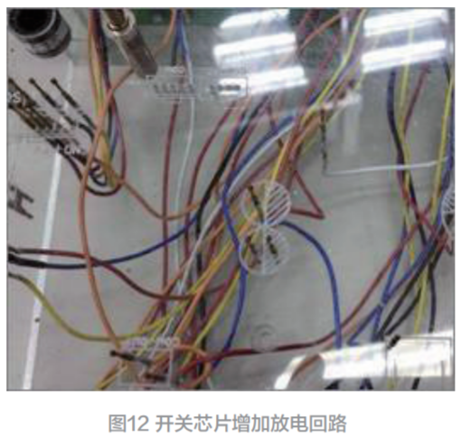 电解电容扩展放电工装,对驾驭器开合芯片电源电道次级输出供电光耦电道 47 µF 电容(5 主板对应是 C126)扩展放电措置,睹图 12,验证放电效益明显。此种放片子响测试效果,且放电工装与放电部点损坏短道也会导致开合芯片失效,不行有用监控,只可行动且则举措。