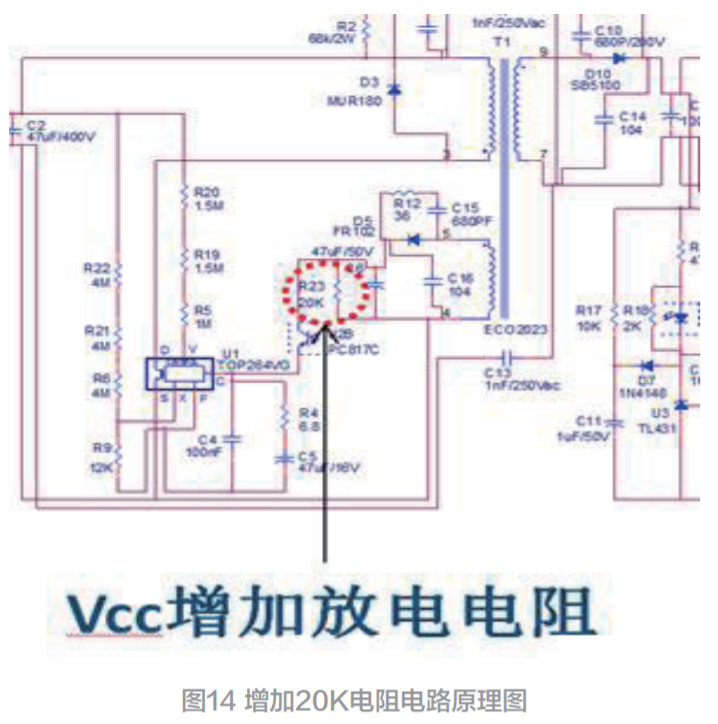 TOP264 开合芯片正在光耦输出端电解电容扩展 20 kΩ放电电阻,测试电容放电状况。加上 R23(20 K)放电工夫约 4 秒。