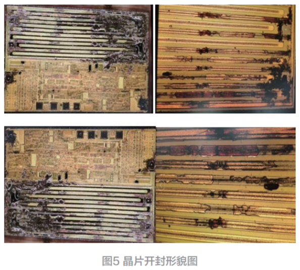 取此中 5 个 挫折样品举行开封考核内部组织,睹图 5 所示,能够看到内部晶片有大面积过电销毁的印迹,未睹产物晶元成立不良。