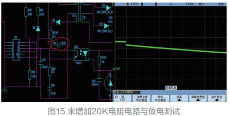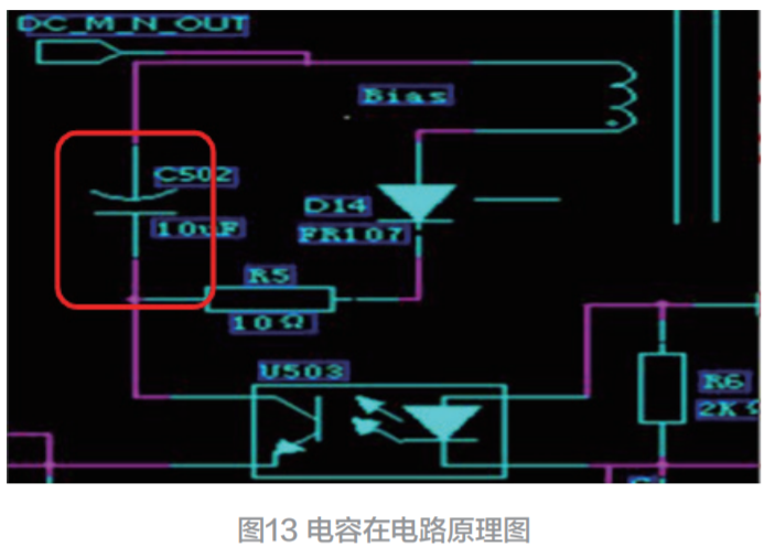 开合芯片集合正在弱电侧驾驭端失效,弱电侧失效无数跟主板线道安排走线及进程 ESD、进程测试放电照料存正在很大相合,分体机中 PI 的开合芯片电道安排存正在亏折,正在主板测试完,光耦输出级处于开道状况,电解电容积储电量是没有负载回道举行泯灭,即使进程照料不妥很容易展现操作、周转等特殊要素导致芯片过电毁伤。依照合系电道领悟,模仿正在光耦供电电道 C502 电解电容(如图 13)两头并联 20 kΩ 片状电阻放电,以便能更好敏捷泯灭电解电容积储的电量,结果显示积储电量 4 秒内工夫泯灭完毕,放电效益明显。