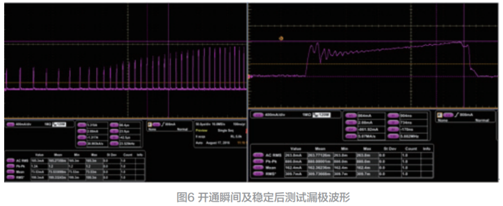 过载测试漏极刹时开通电流峰值,通电 50 次测试最大电流峰值 1.8 A。太平后均匀电流值约 900 mA,通电 50 次测试均匀电流值正在 800 mA-1.2 A。测试波形如图 6 所示。