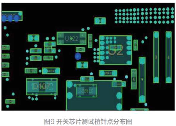 图 9 所示测试植针点散布图,经查此 3 个地方领域内未植针,不存正在短道隐患。FCT 测试工装正在开合电源电道上无定点,不存正在探针短道导致开合电源芯片失效隐患。