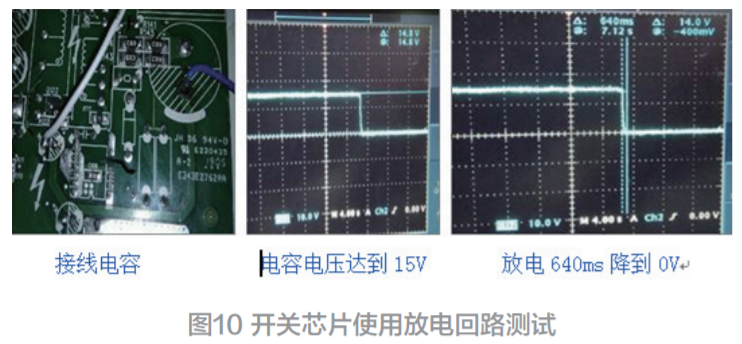 (1)电容两脚接上放电回道,测试完毕后正在640 ms 内电压从 15 V 放到 0 V。