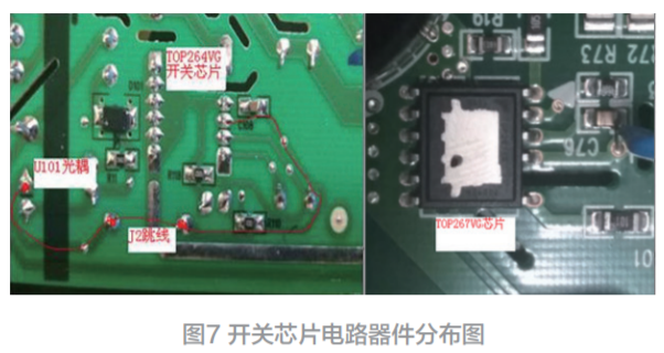 2 款芯片正在电道安排上均正在芯片 4 脚频率引脚 (F) 与 6 脚漏极引脚 (D) 之间开有避火槽,合适驾驭器安排典范,简直睹图 7。比较目前班组临蓐分体机主板(1),开合电源芯片 TOP264VG 第 3 脚进程 J2 跳线 脚上,无防护元件,电道安排上存正在缺陷。柜机主板(5)开合电源芯片第 3 脚有 C76 片状电容 104 K/50 V 防护。