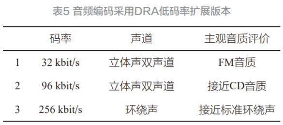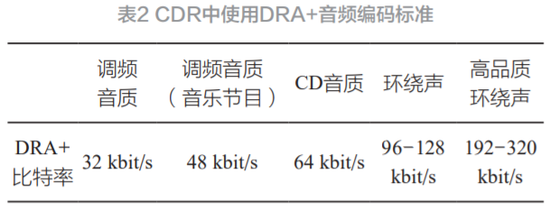 CDR 中利用 DRA+ 音频编码规范,是 DRA 的低码率扩展版。输入信号的规范采样率局限是 16~96 kHz,输出码率局限是 16~384 kbit/s,编码参数可调,正在调频信道内可传输众道立体声节目或一块 5.1 盘绕声节目,并保留较好的主观音响质料。DRA+ 不妨供给立体声和盘绕声两种分层编码形式,统筹了数字调频播送的操纵局限和播送音质。
