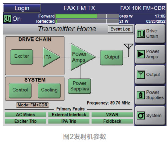 发射机品牌为 GATESAIR,模仿功放模块发射功率 6.4 kW。功放模块正在 FM 模仿作事体例时,作事正在 C 类放大确保效用;正在 FM+CDR 数模混播时,作事正在 AB 类放大确保线性。厉重作事参数如下所述。