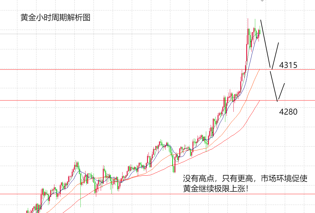 跟着美联储再次夸大本年降息的预期,商场反映比拟大,美元显现大跌空间,黄金则显现暴涨力度,周四黄金单日单边上涨贴近200美金,再次划破夜空,走出天际的新高。现在黄金最高正在4380,原来我认为周四能上涨到4300曾经是极限了,然则现正在看来,商场云云走,没有高点,只要更高。前面正在黄金破位4000之后,山海夸大过,来日黄金的上涨空间再有无穷大,肯定不要猜高,不要做空,顺势做众利润丰富,上方能够参考看到4200,4500高点,现正在4200破位,上涨至4380,曾经亲切4500高点,就看周四是否能延续众头的上涨动力,去4500新高。回归到时间面,周五一定是坚持众头趋向,但同时要防备持重的交往格式是回落做众,譬喻周四上涨后回落低点正在4205,周五回落的支持点要合怀4280和4250两个价位,假设亚欧盘触及这个两个价位不破能够顺势做众,但假设不测跌破4250,本日周五,有大概显现高位扔盘,赢利结算,显现先大跌至4200,这种大概性是商场不测的走势,但正在目前高价位下,不得不防。具体依旧尽量耐心等候回落到环节支持点做众,看是否有新高4500的大概。