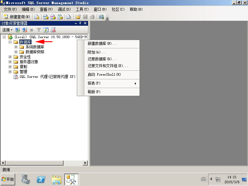 4、进入数据库对象资源治理器,右键点击左侧的“数据库”从弹出的菜单被选择“新筑数据库”;