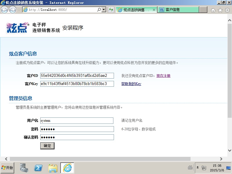 18、将对应的客户 ID 和客户 KEY 复制粘贴到装置序次页面,治理员用户名默以为“system”,输入治理员暗号;
