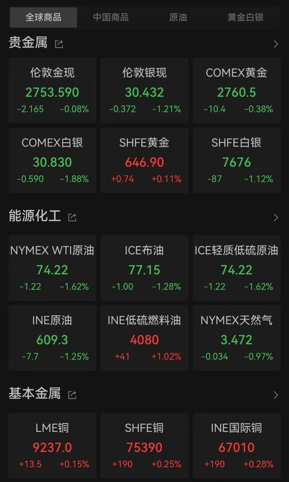 商品市集方面,截至发稿,现货黄金下跌,现货黄金下跌0.08%,报2735.59美元/盎司;COMEX黄金期货下跌0.38%,报2760.5美元/盎司。现货白银跌逾1%,COMEX白银期货下跌1.88%。