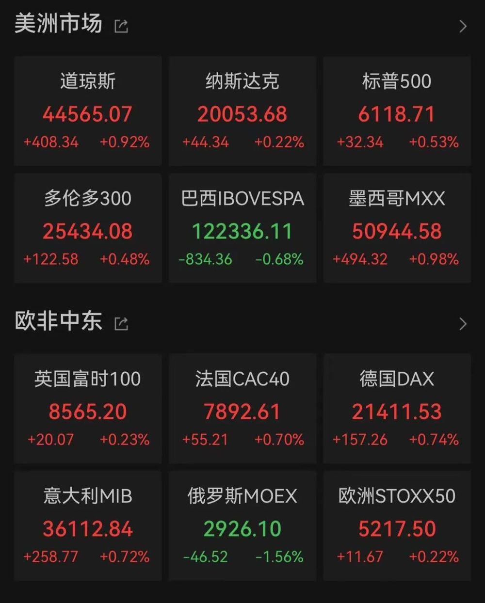 欧美股市全线日,美股三大指数轰动上涨,截至收盘,道琼斯工业指数上涨0.92%涨超400点,纳斯达克指数上涨0.22%,标普500指数上涨0.53%创汗青新高。